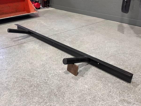 Wall mounted wheel rack for seasonal change over. Set of two, custom made heavy duty welded wheel rack. 70” wide, center post 40” apart.
